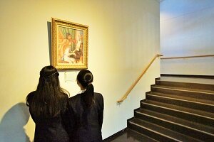 校舎が完成してまもなく、神言会の神父様たちが、12枚の名画の複製を寄贈してくださいました。クレーの優しい天使の絵は保健室の前に。視野がぐんと広がる中2のスペースには、フェルメールの天文学者を。落ち着いて勉強してほしい高3のスペースにはピサロの穏やかな林の絵を飾っていただきました。更に、この校舎の設計を中心になってくださった方のお父様が亡くなった時、このお父様は著名な日本画家でしたが、その方が一番気に入ってみえた「コルトーナの丘」という大きな絵をエントランスに、もう一枚をコンピュータ教室の前に寄贈してくださいました。合計14枚の絵が、皆さんの成長を見守ってくれています。