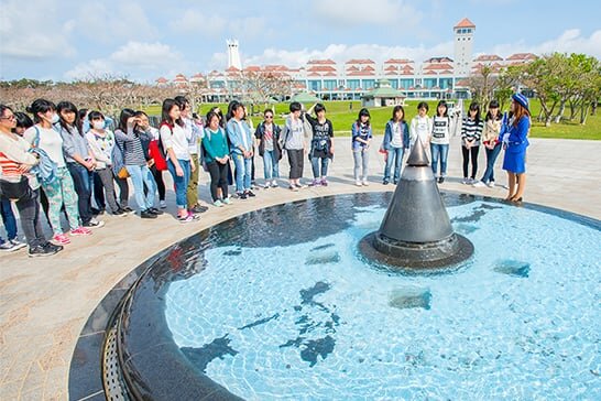 高校2年の2月、沖縄研修旅行を行います。長崎研修旅行と関連性を持たせて、激しい地上戦の舞台となった沖縄を訪問して、これからの人生の中で平和の意味を考えていくことのできる人間になることを目的としています。また、沖縄の独特な琉球文化も体験します。自らテーマを設定して年間を通じて事前学習を行い、班別の自主研修でその総仕上げを行います。最終的にはレポートとして学習の成果をまとめていきます。