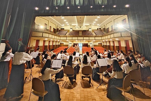 ヴァイオリン・ヴィオラ・チェロ・コントラバスで構成される弦楽オーケストラの部活動です。みんなで奏でる音が美しく響鳴したとき、震えるような感動を味わえます!文化祭や男子部ブラスバンド部とのジョイントコンサート、また海外演奏旅行(ウィーン・プラハ)など、さまざまな場で演奏を披露しています。長野県白馬での夏合宿も楽しみの一つです。