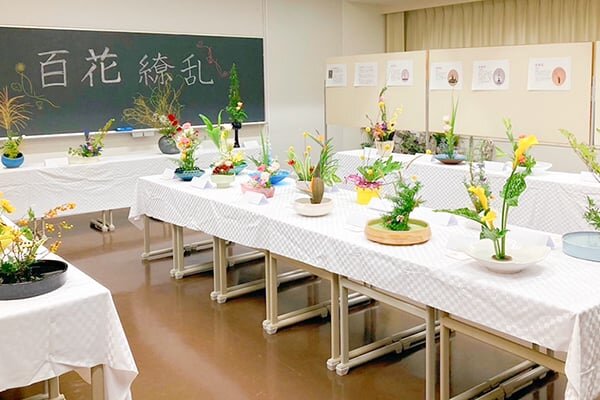 平安時代に京都で生まれた嵯峨御流の講師の先生にご指導いただき、季節ごとのお花を生けています。同じ花材でも、生ける人の個性が表れ、その人らしい作品が出来上がるところが、生け花の最大の魅力です。